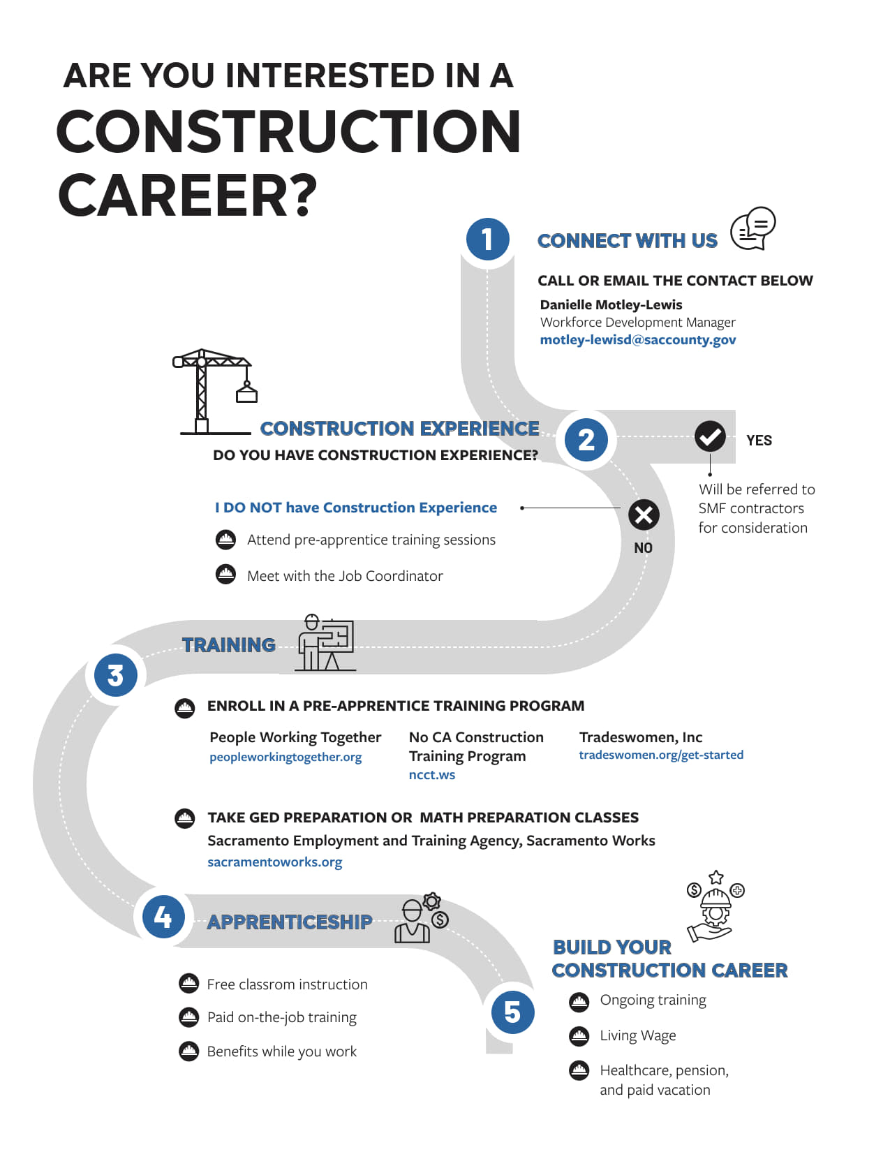 Pre-Apprentice Training: People Working Together, Northern California Construction Training Program, and Tradeswomen, Inc. offer pre-apprentice programs, including classroom instruction and hands-on skills training for individuals starting their journey in construction. See the Construction Career flyer for more information.