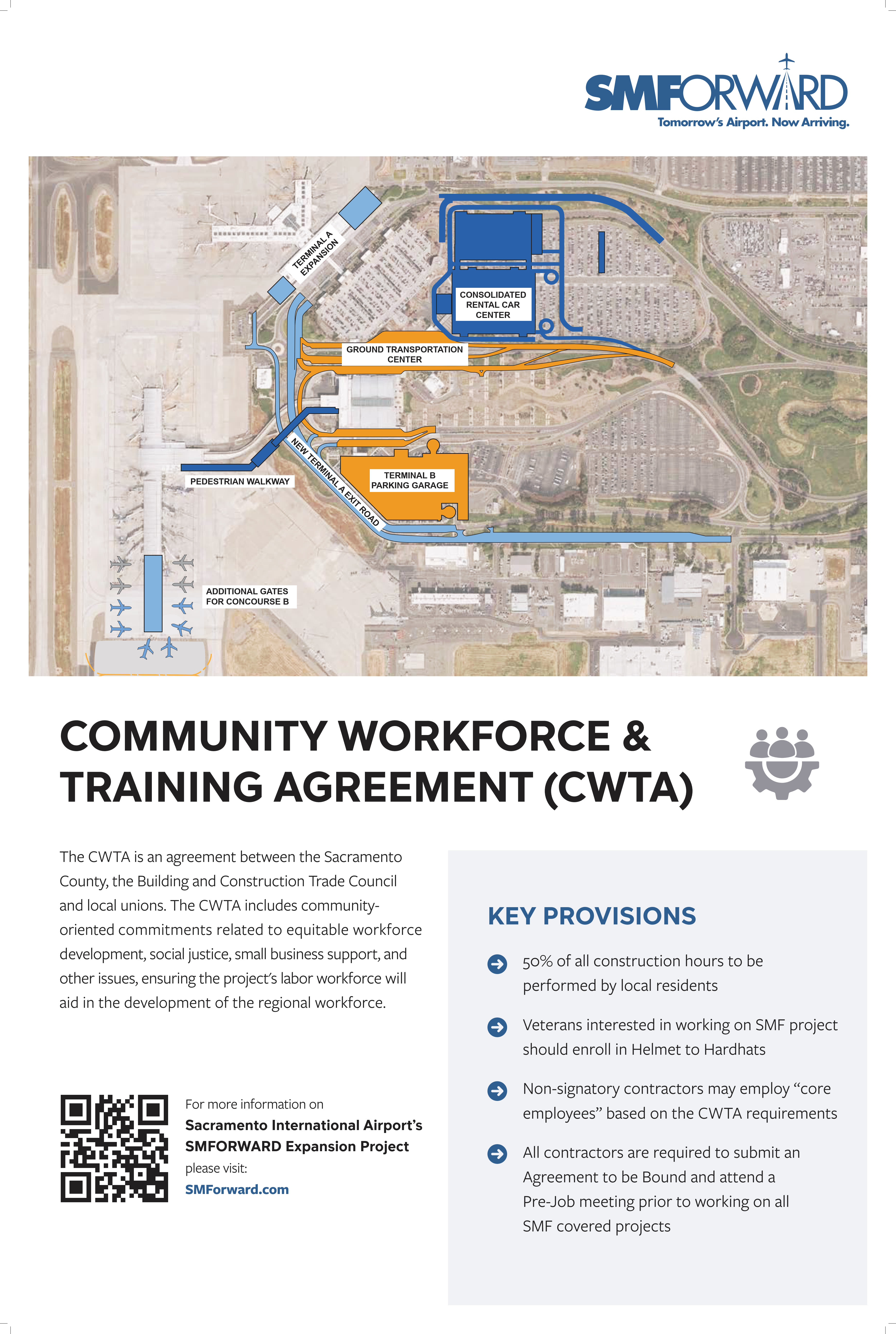 The County of Sacramento (County) Department of Airports (Department) is soliciting proposals from qualified firms, organizations, and service providers to provide administrator services for a Community Workforce and Training Agreement (CWTA) in conjunction with the construction of six large-scale capital projects comprising the County’s “SMForward” projects at Sacramento International Airport (SMF). The County anticipates awarding one agreement under this Request for Proposals (RFP).